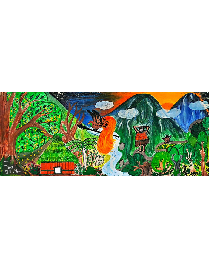 Pada hamparan langit yang sama, seekor Burung Cendrawasih dilukiskan menari dengan anggun, kepak sayapnya memancarkan identitas dan kebanggan bumi cendrawasih. Bagi Frince, burung ini bukan sekedar ikon, ia adalah penjaga keindahan,penanda kelestarian dan titisan harapan akan masa depan budaya Papua yang harus terus dijaga. Unsur budaya itu makin hidup lewat Rumah Honai yang hangat dan kokoh serta Pohon Matoa yang bergelimang buah merah, yang bagi masyarakat Mamit bukan hanya anugerah alam, tetapi juga sumber penyembuhan dan kekuatan.,