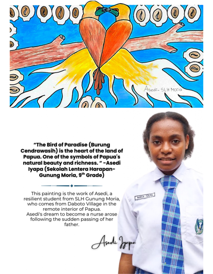 Asedi lahir di Daboto, sebuah desa terpencil di pegunungan Papua. Sejak kecil, ia sudah terbiasa berjalan kaki berjam-jam melintasi pegunungan hanya untuk pergi ke sekolah. Malam hari, ia belajar di bawah cahaya api, satu-satunya sumber penerangan di rumah sederhana keluarganya. Hidupnya penuh perjuangan — empat saudara kandungnya meninggal di usia muda, dan Asedi sendiri pernah kehilangan satu jari karena kepercayaan adat. Meski sering sakit dan menghadapi banyak keterbatasan, semangatnya untuk belajar tak pernah padam. Ketika ayahnya meninggal dunia karena tidak ada akses layanan kesehatan, tumbuh tekad dalam hati kecil Asedi: suatu hari nanti, ia ingin menjadi dokter agar orang-orang di desanya tidak lagi kehilangan nyawa tanpa pertolongan. Perjalanannya hampir terhenti ketika pamannya hampir menikahkannya dengan seorang pria dari desa lain. Namun dengan keberanian dan iman, Asedi menulis surat kepada pamannya, mengingatkan janji bahwa ia harus bersekolah sampai berhasil. Tuhan menjawab doanya — ia diizinkan melanjutkan sekolah, dan kini Asedi bersekolah di SLH Gunung Moria, Karawaci. Dari seorang gadis kecil di pedalaman yang belajar di bawah cahaya api, kini Asedi menyalakan terang harapan melalui semangat dan karya seninya. Setiap langkahnya menjadi bukti bahwa dari luka dan keterbatasan, Tuhan sedang menulis kisah yang penuh harapan.