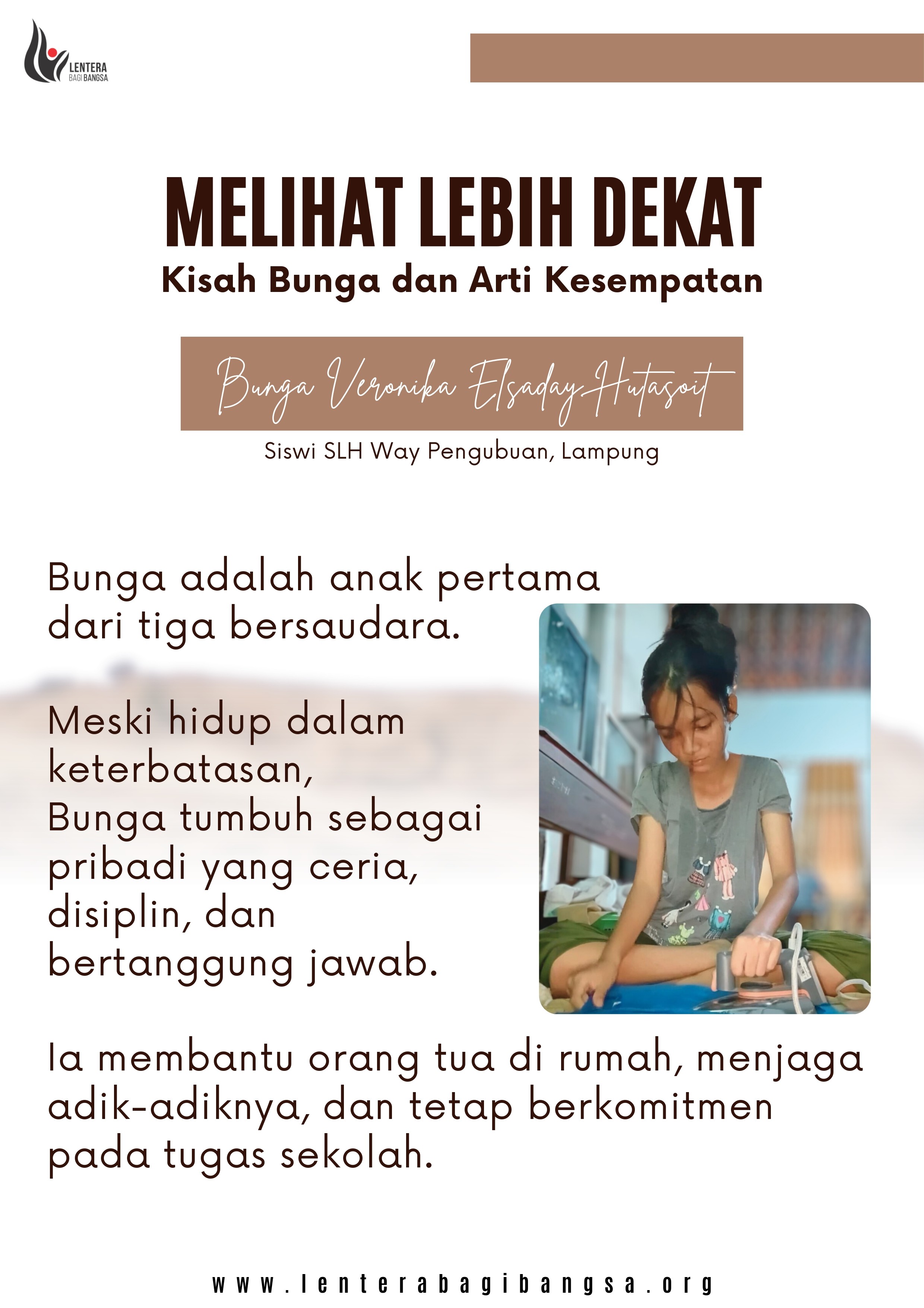 dan tetap berkomitmen pada tugas sekolah. Meski hidup dalam keterbatasan, Bunga
